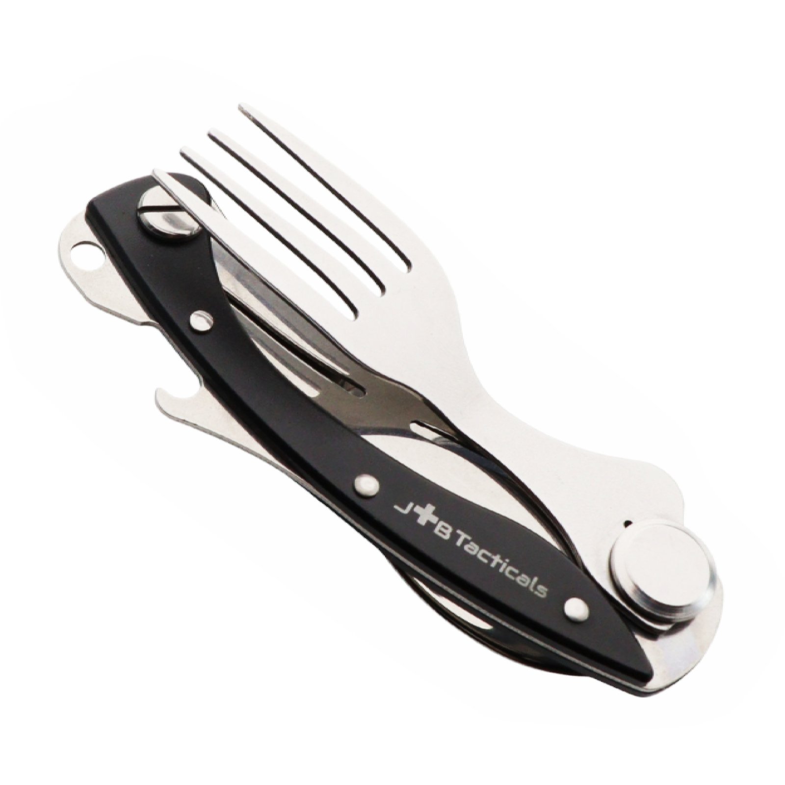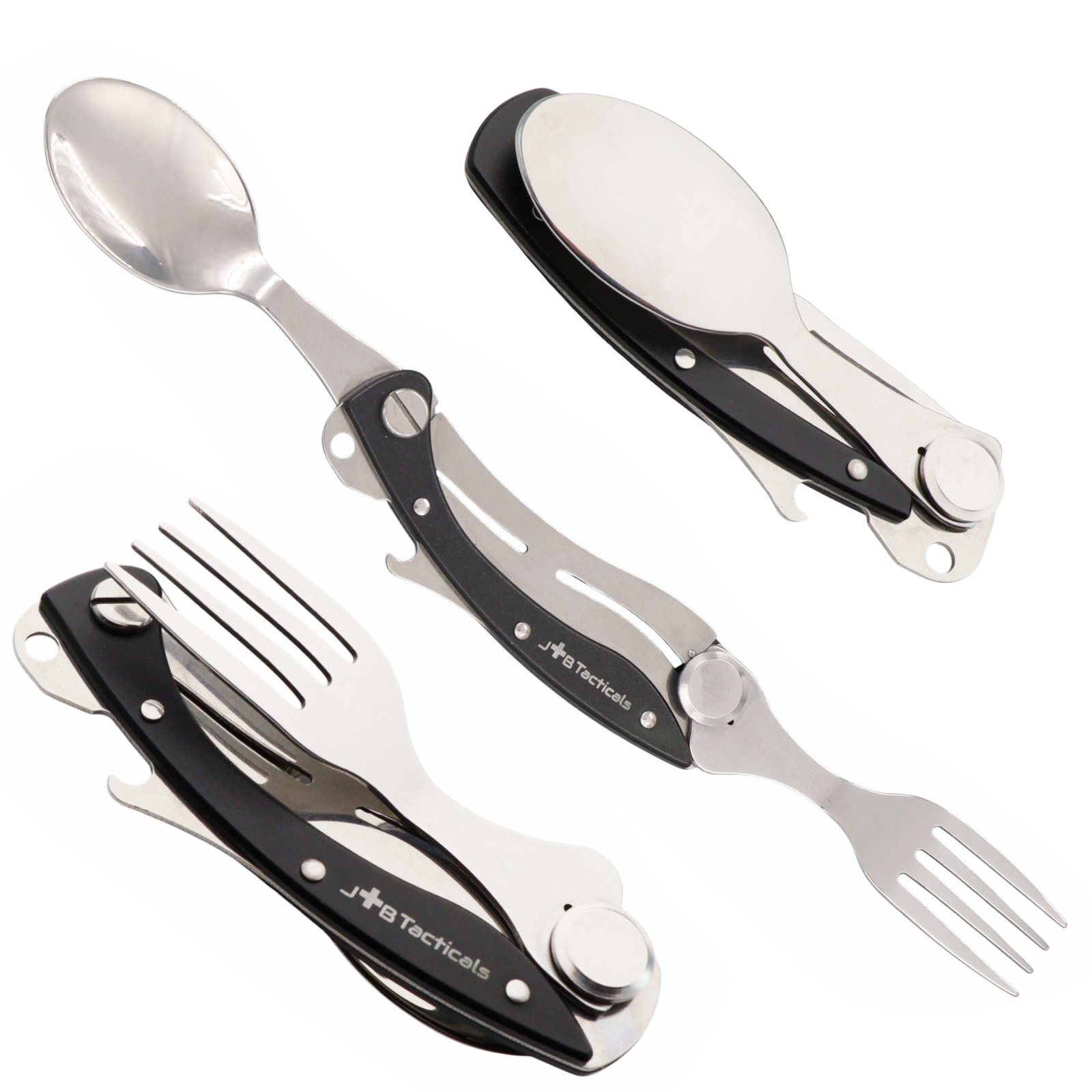 „JB Tacticals 4-in-1 Outdoor Essentials Kit“ – tai kompaktiškas įrankis, kuriame derinami pilno dydžio stalo įrankiai su būtiniausiomis funkcijomis bet kokiai kelionei.