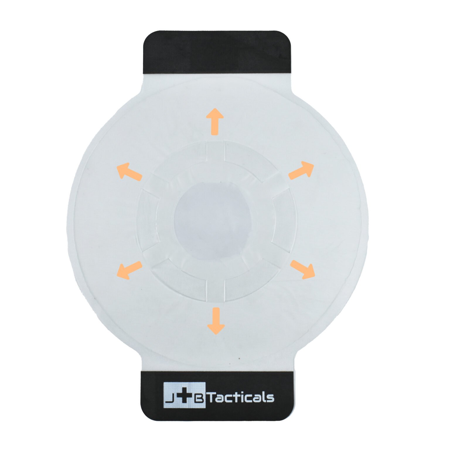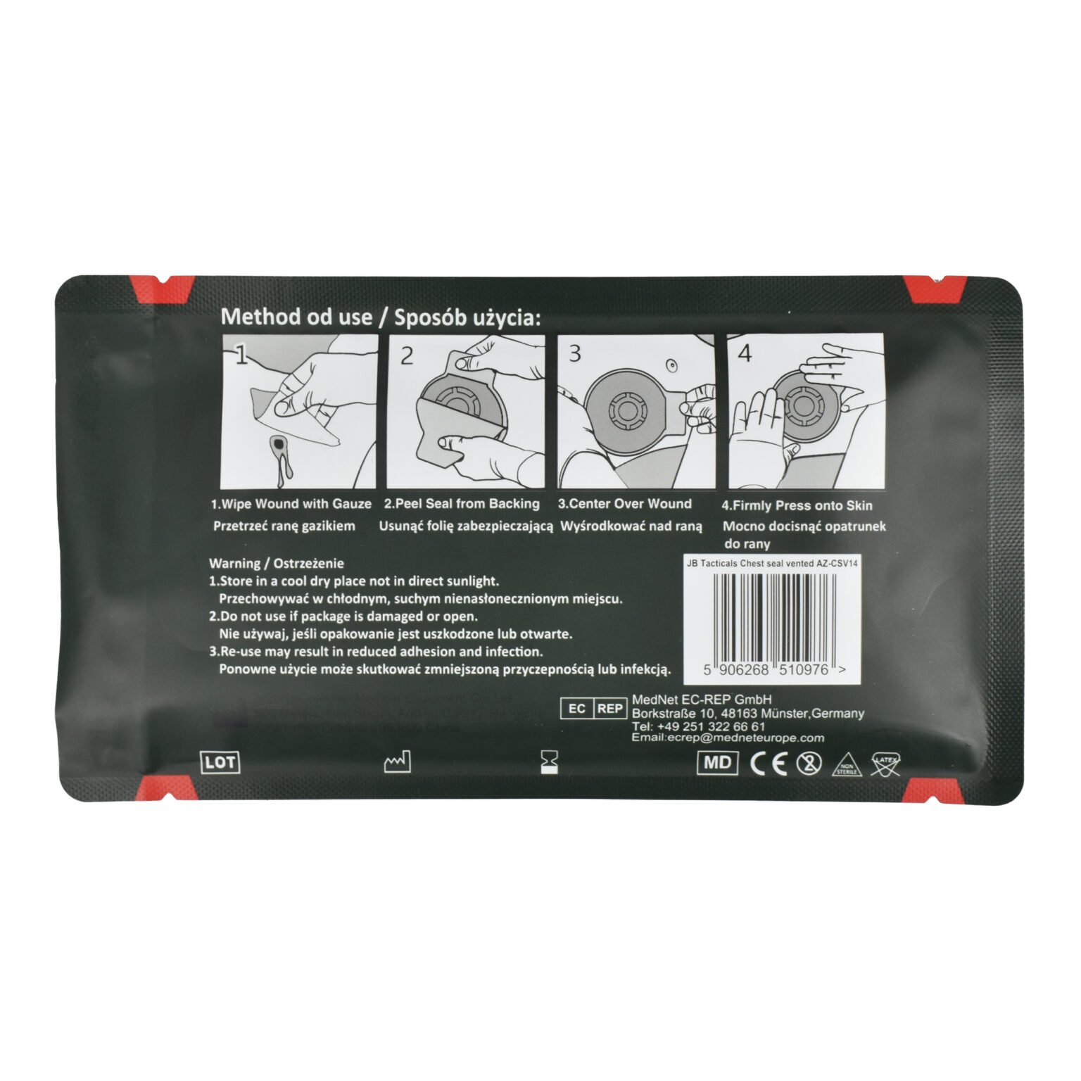 „JB Tacticals AZ-CS14“ ventiliuojamas krūtinės sandarinimo tvarstis yra skubios pagalbos tvarstis , kuris yra pagrindinis bet kurios pirmosios pagalbos vaistinės komponentas. Idealiai tinka naudoti skubios pagalbos atvejais, ypač šautinių žaizdų ir krūtinės traumų atvejais , jis užtikrina greitą, efektyvią ir saugią žaizdų priežiūrą, sumažindamas su oro patekimu susijusių komplikacijų riziką.