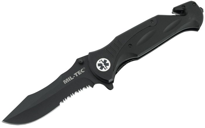 Mil-Tec Rescue Knife Medicininis kišeninis peilis 440/G10. Sulenkiamas peilis daliniu dantytu kraštu, 440 plieno ašmenimis ir stiklo pluoštu sustiprinta G10 rankena.