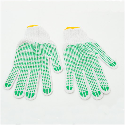 Pirštinės megztos su žaliais PVC taškais iš abiejų pusių. 10 dydis. Kiekis pakelyje – 12 porų, kiekis dėžėje – 300 porų.